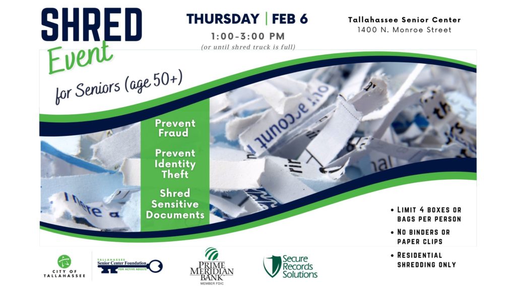 Business Partners AARP & Prime Meridian Bank are bringing a shred event for seniors to the Tallahassee Senior Center (1400 N. Monroe Street) Thursday, February 6th from 1 – 3 PM (or until truck is full).
